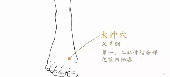 太沖穴:足背內側第一跖骨間隙的后方凹陷處。