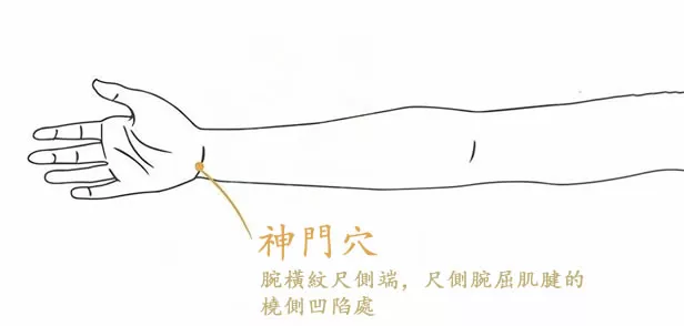 具有安定心神、瀉心火的功效。日常可隨時掐、揉刺激神門穴,以有輕微酸脹感為宜。晚間就寢時以右手大拇指按左手神門穴5~10次,再用同樣的方法按摩右手,有利入睡。