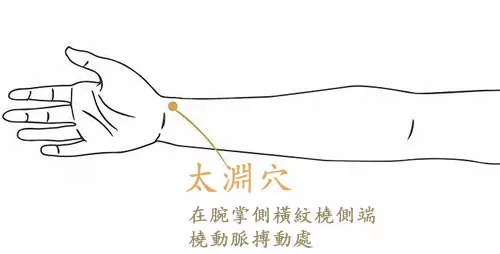 太淵穴:腕橫紋上,橈動脈搏動處。