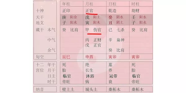 我們來看一個典型的例子。下面這個八字,正官透干,官印相生本來非常之好,但是月支的傷官為本氣,直接克制了月干的正官。表面上看是官印相生,但其實是傷官見官,官星仍然可用但不穩定。對于這個正官星而言,月支的傷官就是“無情”的,而年干的正印就是有情的。